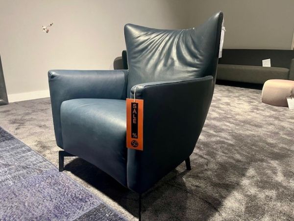 De Quattro fauteuil van Raanhuis is bestofeerd in blauw leder.